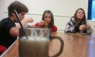 Pues ahora si que si, estamos ya todos juntos desayunando y... Aqui nieva!!!